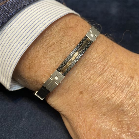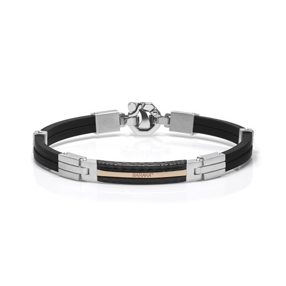 Bracciale Baraka Uomo LUNGO 20,5 CM Il gioiello è in Oro 750, argento 925, acciaio PVD e fibra di carbonio. La chiusura a moschettone è impreziosita con un diamante naturale di caratura 0,02. I gioielli Barakà sono realizzati artigianalmente da maestri orafi italiani per l’uomo che ama il lusso.