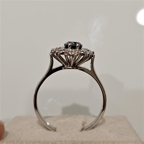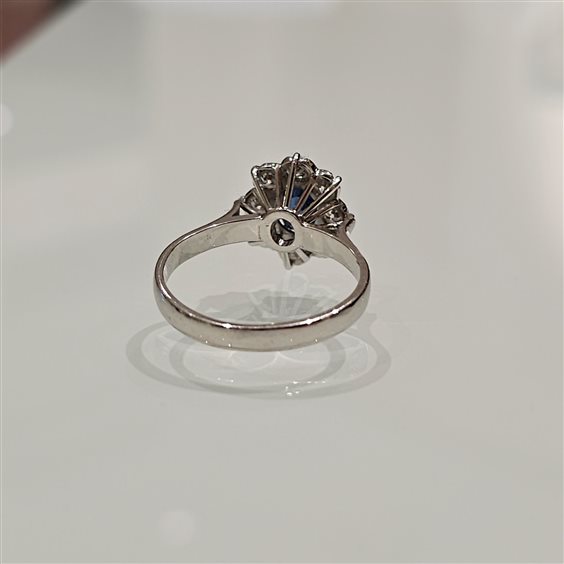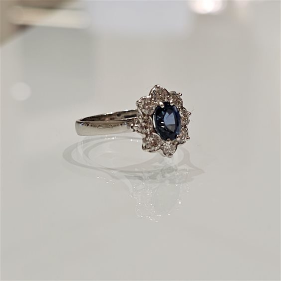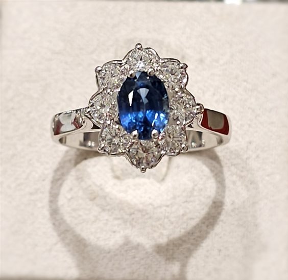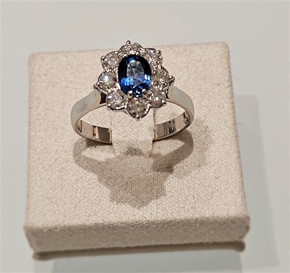 Anello in oro bianco 750%.. con uno zaffiro centrale ct. 1,31 e diamanti attorno ct. 0,72 colore F purezza SI. Misura anello 16 con possibilità di messa a misura. Scatola e certificato di garanzia.