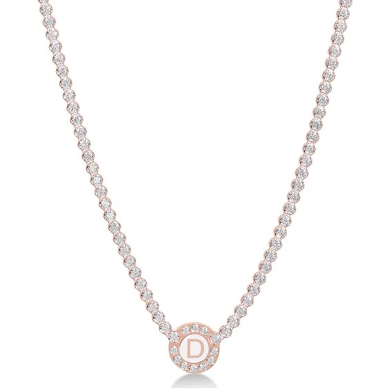 collana Charlotte tennis in argento 925 rosa. Il cerchio, adornato da gemme zirconi, aggiunge un tocco di luce all'accessorio, mentre la lettera iniziale "D" su smalto bianco lo personalizza ulteriormente. Un capolavoro di artigianato italiano, perfetto per completare ogni outfit con stile. SCATOLA E GARANZIA ORIGINALE LUNGHEZZA CATENA CM 38 + 5 CM DI ANELLINI