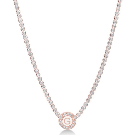 collana Charlotte tennis in argento 925 rosa. Il cerchio, adornato da gemme zirconi, aggiunge un tocco di luce all'accessorio, mentre la lettera iniziale "G" su smalto bianco lo personalizza ulteriormente. Un capolavoro di artigianato italiano, perfetto per completare ogni outfit con stile. SCATOLA E GARANZIA ORIGINALE LUNGHEZZA CATENA CM 38 + 5 CM DI ANELLINI