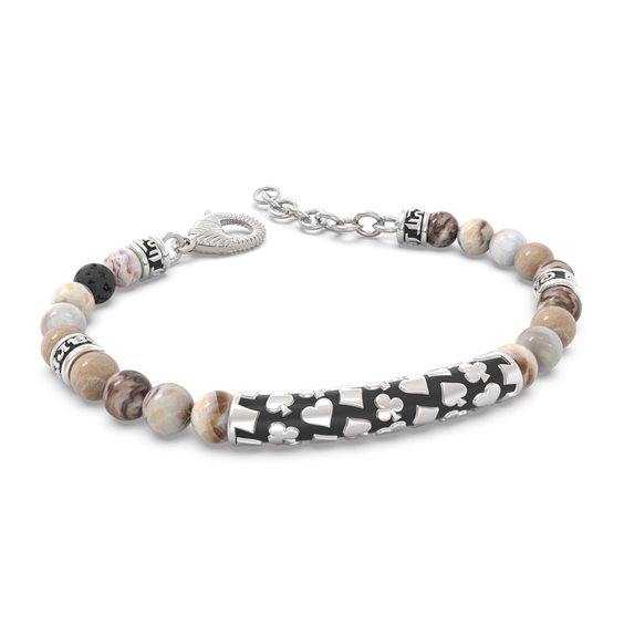 L’Agata, una pietra naturale, appartiene alla vasta famiglia dei calcedoni ed è stata utilizzata fin dall’antichità per la creazione di gioielli e ornamenti. In particolare, l’Agata Striata è riconoscibile per una caratteristica peculiare: secondo la credenza degli antichi, maggiore era il numero di striature presenti sull’agata, maggiore era la sua capacità di proteggere chi la indossava. Tutti i bracciali El Barrio sono prodotti con pietre naturali. La lega metallica argentata di cui sono composti, ha un ulteriore bagno di platino. Ciò li rende unici, preziosi e duraturi. MISURA BRACCIALE 17,5+3 CM