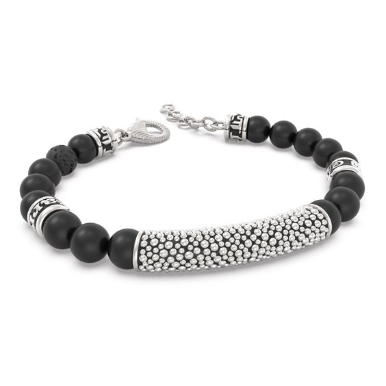 L’Onice nero è una pietra preziosa di origine vulcanica, che fa parte della famiglia dei calcedoni. Il suo nome, “onice”, affonda le radici nell’antica lingua greca, derivando dalla parola “onux”, che significa “unghia” o “artiglio”, sottolineando così la sua notevole durezza. Spesso chiamata la “pietra della maturità”, l’Onice nero è conosciuta per la sua potente energia ed è particolarmente apprezzata da coloro che già possiedono una forte forza di carattere e un profondo equilibrio interiore. Nel caso di questo bracciale, l’Onice è stato lavorato con una finitura sabbiata, conferendo un tocco unico ed elegante al gioiello. Tutti i bracciali El Barrio sono prodotti con pietre naturali. La lega metallica argentata di cui sono composti, ha un ulteriore bagno di platino. Misura bracciale 19,5 + 3 cm