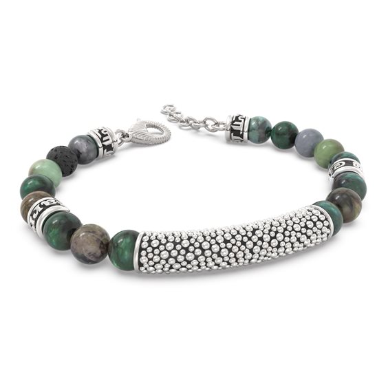 L’agata indiana è conosciuta anche come la “pietra dell’equilibrio”. Questa potente gemma verde promuove la compostezza, la maturità e la stabilità interiore. Il significato dell’agata indiana è la vittoria sul male. Si tratta di una pietra semipreziosa che simboleggia la sicurezza emotiva, l’energia equilibrante e la protezione. Tutti i bracciali El Barrio sono prodotti con pietre naturali. La lega metallica argentata di cui sono composti, ha un ulteriore bagno di platino. Ciò li rende unici, preziosi e duraturi. Per polsi fino a 23 cm