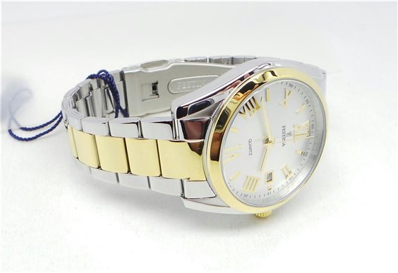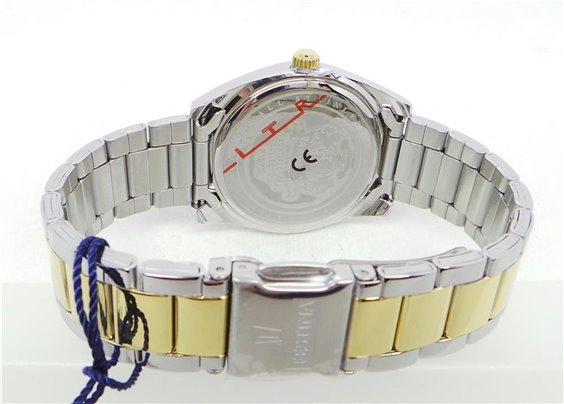 Orologio solo tempo al quarzo da donna con datario sul "3"; cassa (diametro 35mm) e cinturino in acciaio dorato anallergico con pratica chiusura a pulsante; quadrante silver; w.r. 5 ATM