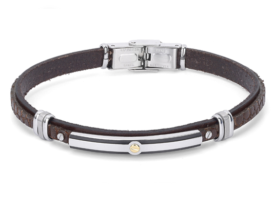 Bracciale in acciaio 316L e cuoio italiano con Texture marrone, piastra centrale in acciaio e PVD nero con vite in oro 18kt (gr 0,03). MATERIALE: Acciaio 316L (anallergico) CUOIO: Marrone ORO: 18 kt ( gr 0,03) MISURA: 21 cm SPESSORE: 7x3 mm PESO: 15 gr I gioielli H2on sono esclusivamente di produzione italiana con misura personalizzabile, accompagnati dalla propria confezione regalo e certificato di autenticità.