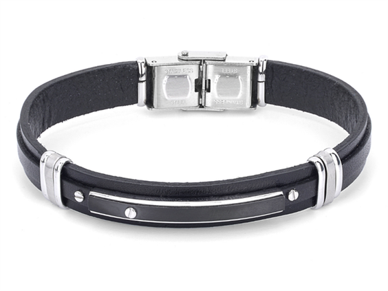 Bracciale in acciaio 316L e cuoio Italiano di colore nero con piastra centrale in acciaio PVD nero e vite. MATERIALE: Acciaio 316L (anallergico) CUOIO: Nero MISURA: 21 cm LARGHEZZA: Cuoio 10 x 3 mm PESO: 19 gr I gioielli H2on sono esclusivamente di produzione italiana con misura personalizzabile, accompagnati dalla propria confezione regalo e certificato di autenticità.