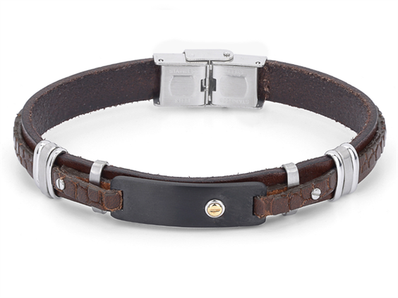 Bracciale in acciaio 316L e cuoio italiano con Texture marrone, piastra centrale in PVD nero e vite in oro 18kt (gr 0,03). MATERIALE: Acciaio 316L (anallergico) CUOIO: Marrone ORO: 18 kt ( gr 0,03) MISURA: 21 cm SPESSORE: 10x3 mm PESO: 15 gr I gioielli H2on sono esclusivamente di produzione italiana con misura personalizzabile, accompagnati dalla propria confezione regalo e certificato di autenticità.