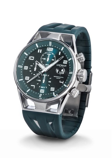 Orologio unisex , movimento cronografo al quarzo , cassa in acciaio 316L mm 41 , quadrante verde petrolio con dettagli bianchi , datario , vetro zaffiro , corona a vite , fondello in titanio a vite , numero seriale di produzione inciso sul fondo , cinturino in silicone verde petrolio regolabile , chiusura a farfalla con pulsanti. Immagine indicativa , la confezione può variare di forma e colore.