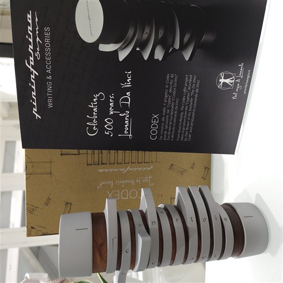 Il Codex è realizzato in alluminio e legno di noce; verrà prodotto per un periodo di tempo limitato - solo nel 2019 - in occasione del 500esimo anniversario dalla morte di di Leonardo da Vinci. Il Codex prende ispirazione dal Cryptex de "Il codice Da Vinci"di Dan Brown; un dispositivo - che lo scrittore attribuisce a Leonardo da Vinci - che custodisce all'interno informazioni accessibili solo a chi indovina la corretta sequenza di lettere tra quelle presenti sui dischi rotanti. Lo stesso meccanismo del Crystex è applicato al Codex: allineando le lettere che compongono il codice, le tacche interne si dispongono in modo tale da permettere l'apertura del cilindro. Suggestivo e affascinante, dedicato da Pininfarina Segno a tutti gli appassionati del Codice Da Vinci e a coloro a cui piace pensare che il Cryptex avrebbe veramente potuto essere frutto del genio di Leonardo; per rivivere ogni giorno il mistero evocato dal romanzo. All'interno c'è la matita originale con punta in ethergraph. SCATOLA E CERTIFICATO ORIGINALI