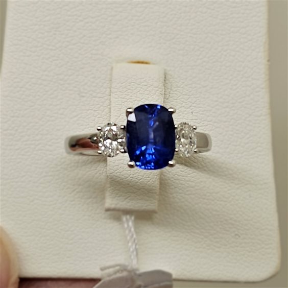 Anello in oro bianco 750%.. con uno zaffiro centrale ct 2,56 e due diamanti ai lati ct. 0,51 G VS. Misura anello 13 con possibilità di messa a misura. Scatola e certificato di garanzia.