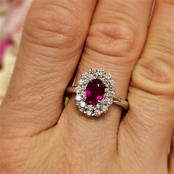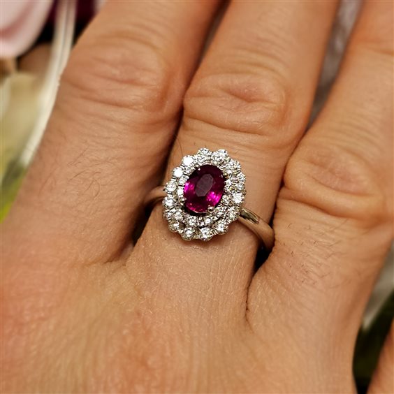 Anello in oro bianco 750%.. con doppio contorno di diamanti ct 0,69 colore G VS e incassato un rubino ovale al centro ct 0,90. Misura anello 13 con possibilità di messa a misura. Il tutto con scatola e certificato di garanzia.