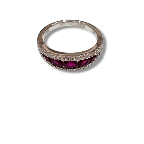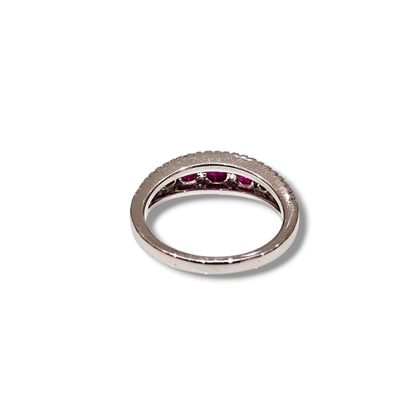Anello in oro bianco 750%.. con rubini centrali ct. 0,81 e diamanti laterali ct. 0,30 - Misura anello 13