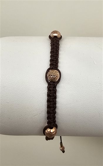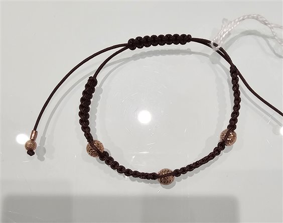 Bracciale in corda marrone regolabile con sfere in oro 750%.. rosè lavorazione diamantata. Dimensione sfere 5,5 mm