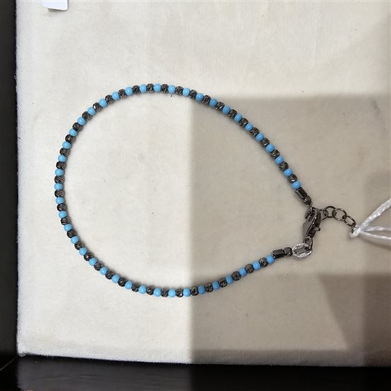 Bracciale in argento 925%.. brunito con turchese e sfere diamantate. Chiusura a moschettone ed anellini di regolazione cm 19 + 2