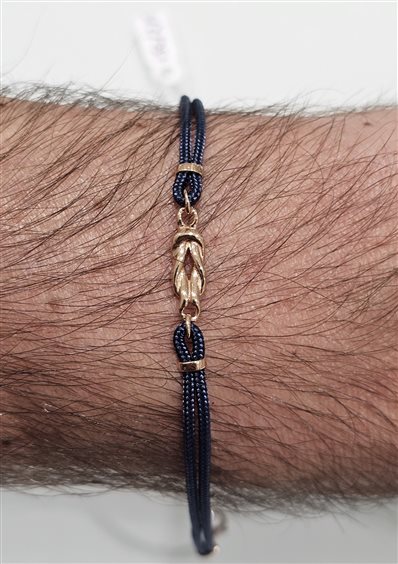 Bracciale in corda blu con nodo centrale in oro rosè 750%.. e chiusura a moschettone in oro bianco 750%.. con anellini di allungo cm 19+2